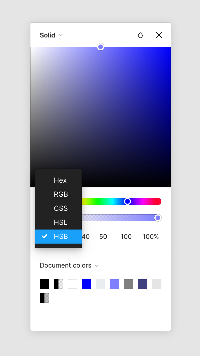 피그마에서 HSB 색상 모델을 확인하려면, Fill > Color picker> HSB로 옵션을 바꿔주면 볼 수 있다.