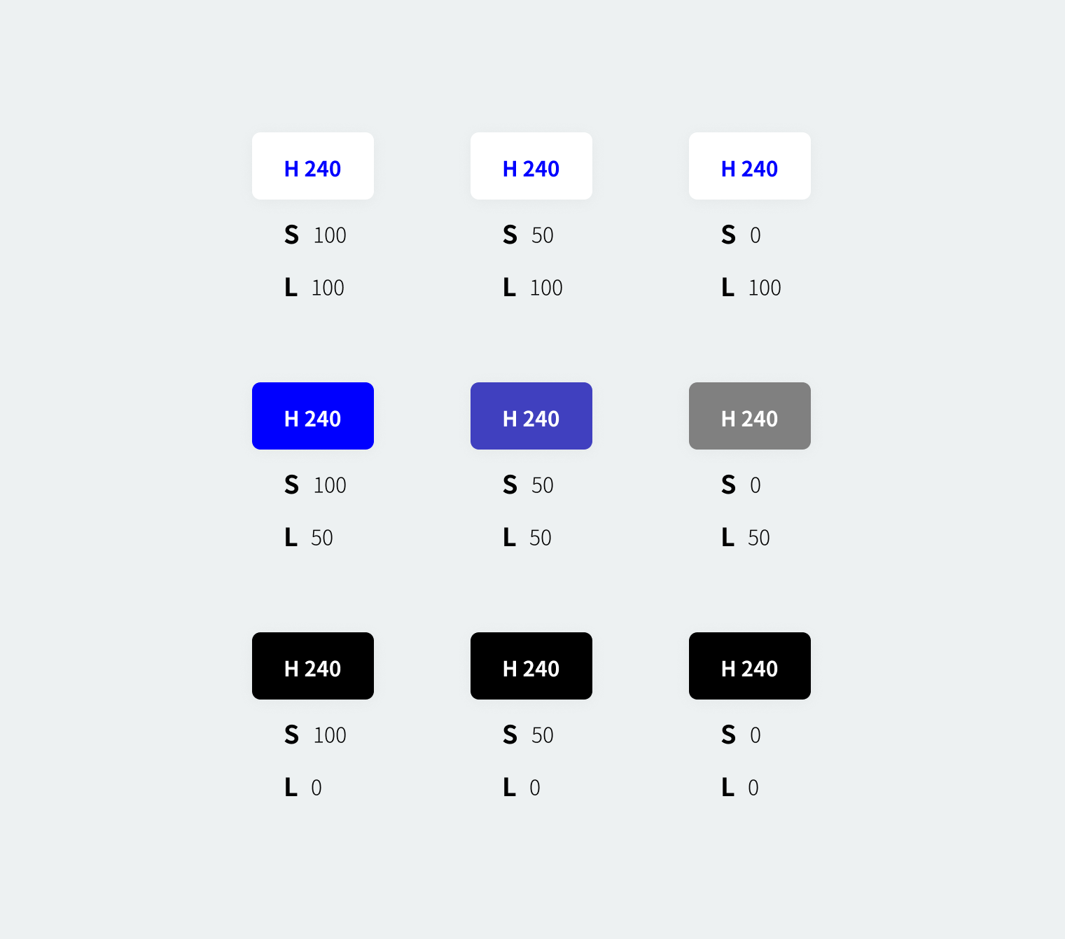 HSL 모델의 예제도 만들어보았다. Satuation과 Lightness의 작동방식을 한눈에 알 수 있다.